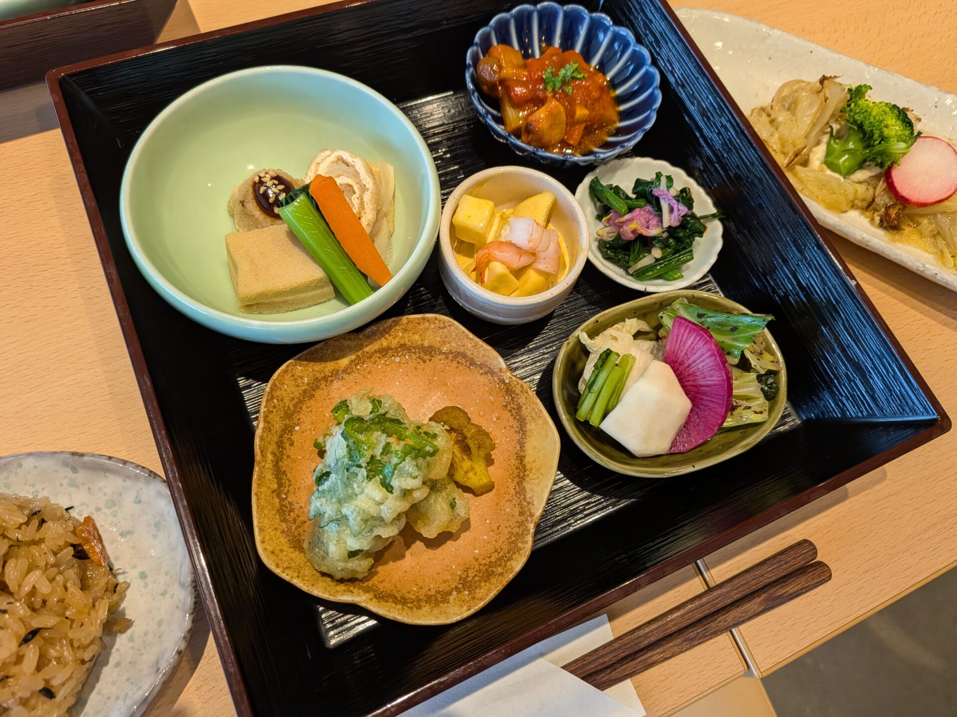 我們選用多種無農藥栽培的蔬菜,用心準備對身體溫無負擔的午餐。請務必來品嚐甘甜又美味的蔬菜。